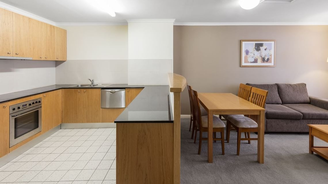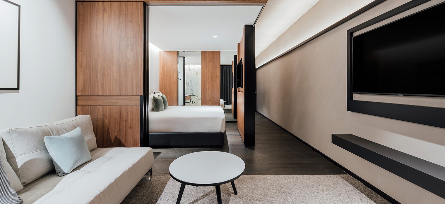 Spacious one bedroom apartment with king bed, full kitchen and laundry, separate lounge/dining area, pod coffee machine, individually controlled air-conditioning, WiFi and exclusive bath amenities by Hunter Lab.