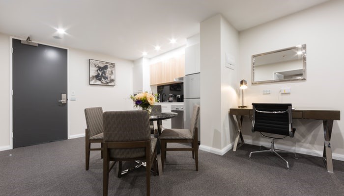 All apartments offer one king bed, individually controlled air-conditioning, WiFi (for a fee), pay per view movies, mini bar, tea/coffee making facilities, a separate lounge and dining area, kitchen and a fully equipped laundry.