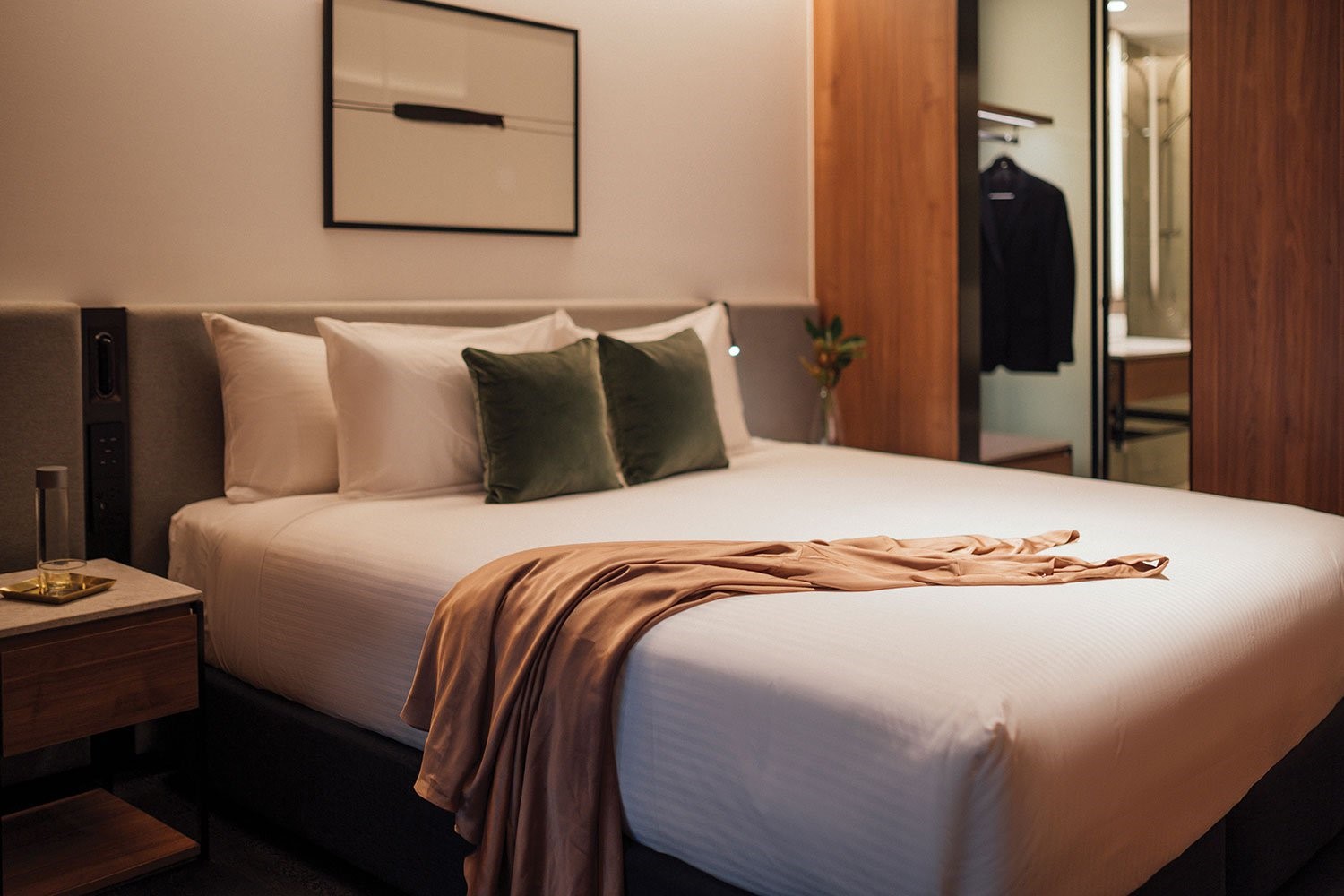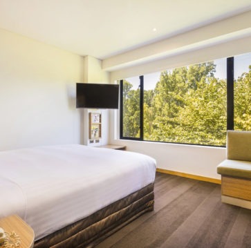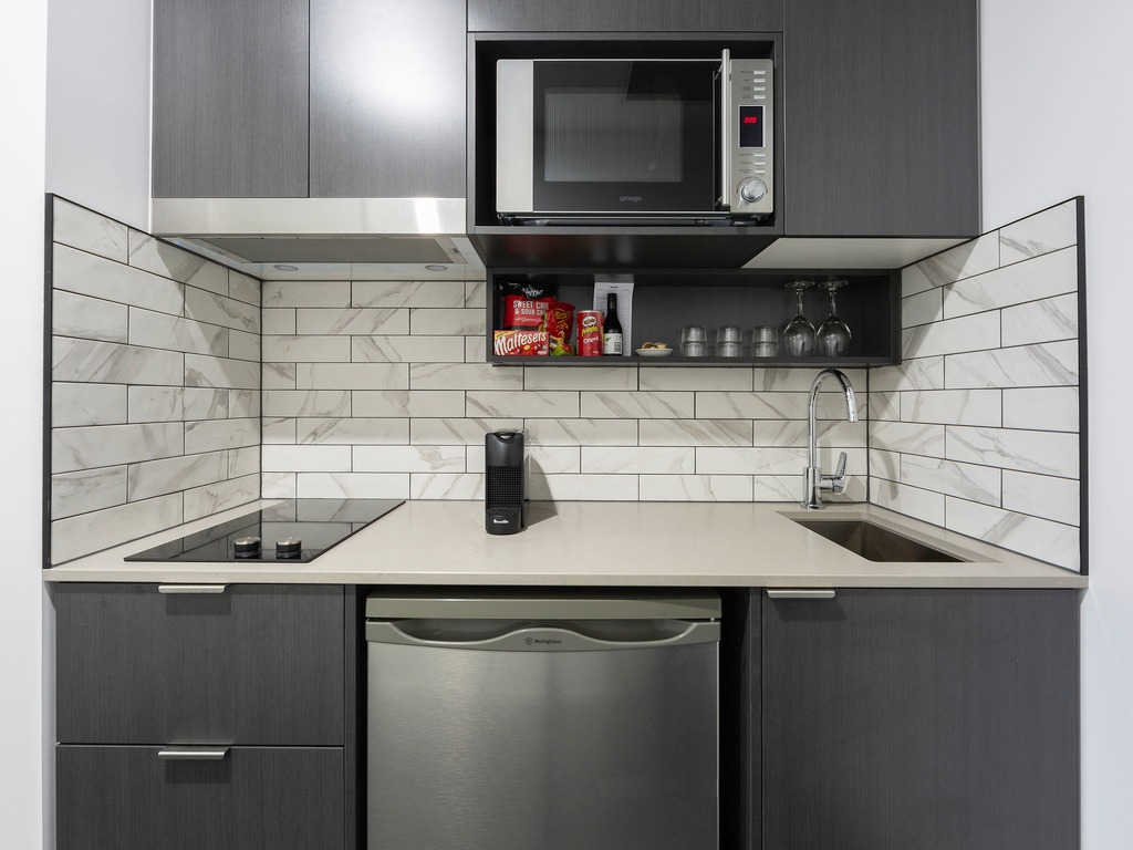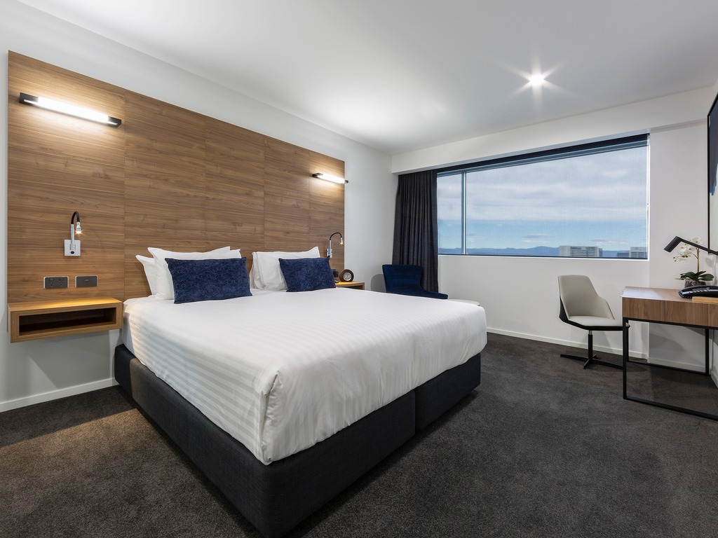 Contemporary & spaciously designed open plan guest room with city and lake views featuring fully equipped kitchenette, Nespresso coffee machine, luxurious pillow top King Bed,generous desk space, dining table, ensuite bathroom with a walk in shower, free Wi-Fi, I-pod dock, 55 inch Samsung UHD TV with Foxtel and movies on demand.