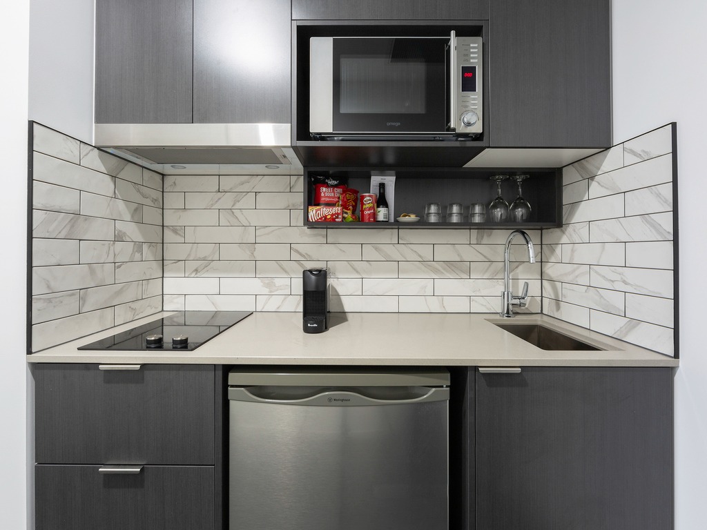 All studio apartments have one king bed, kitchen and laundry facilities, in-room safe, shower over bath, WiFi access and bathroom amenities.