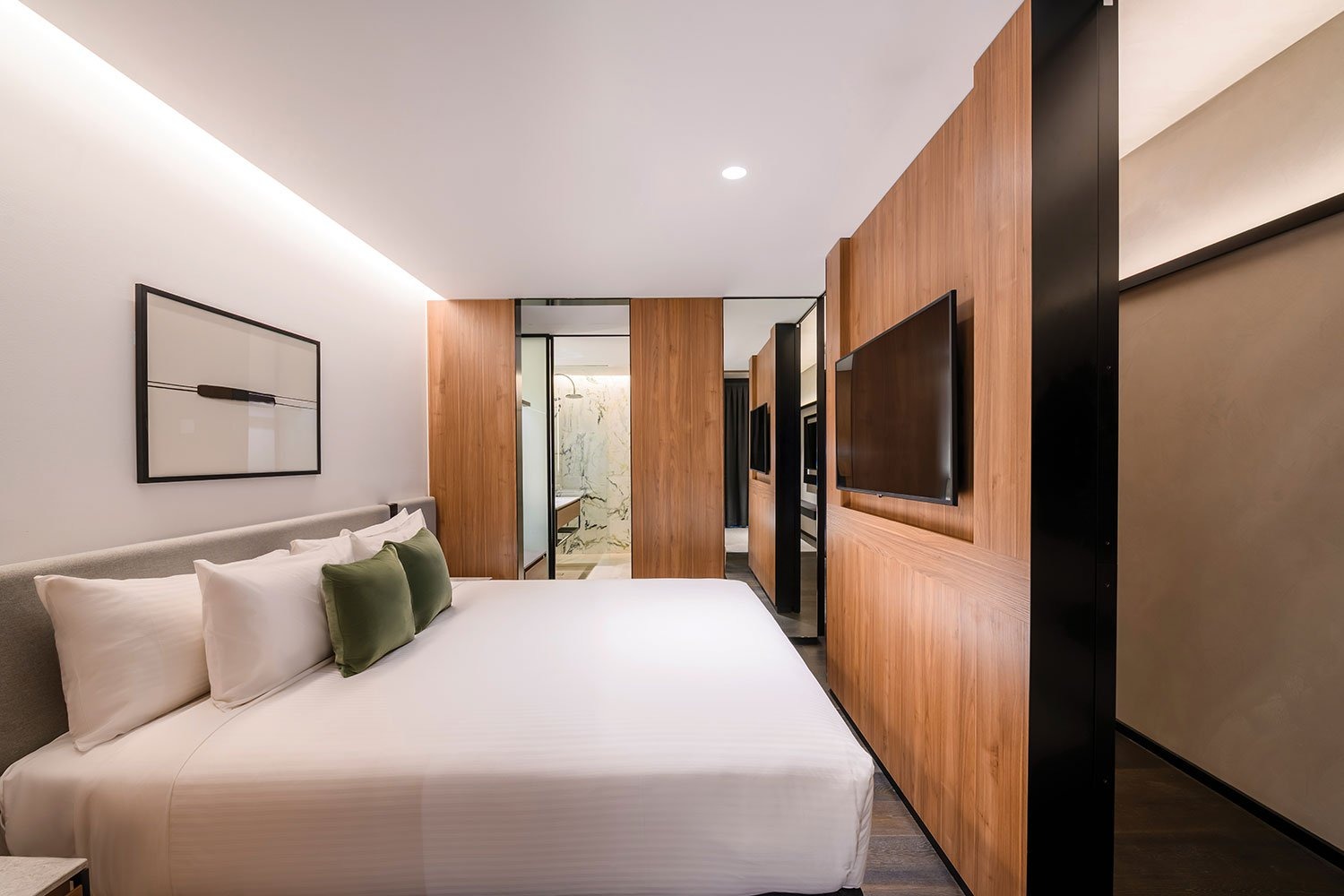 Open-plan standard studio rooms come with King bed, kitchenette, WiFi, pod coffee machine, individually controlled air-conditioning and exclusive bath amenities by Hunter Lab.